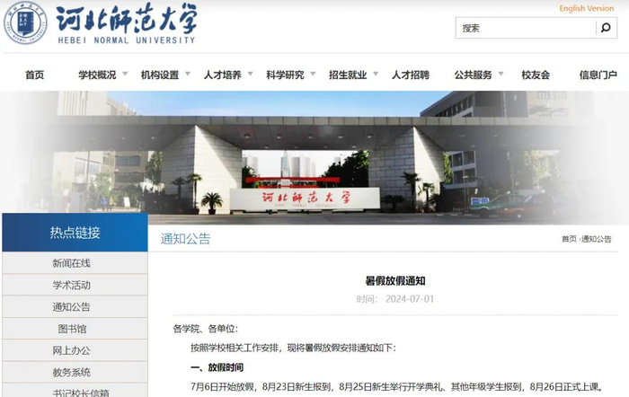 2024年7月22日至8月24日,各部门、单位根据实际情况安排教职员工进行轮休。8月25日,全体教职工返校报到;8月26日正常上班。