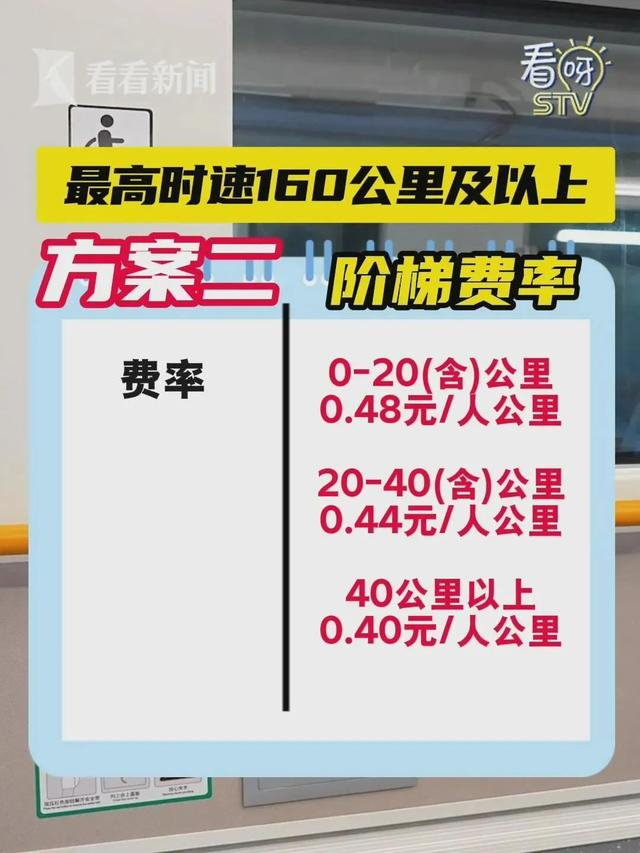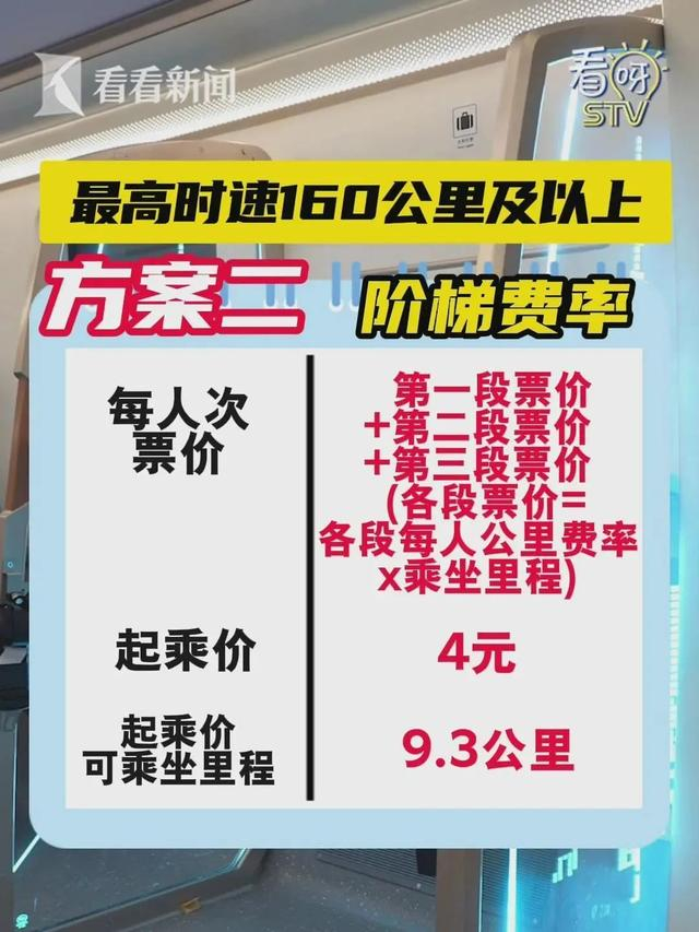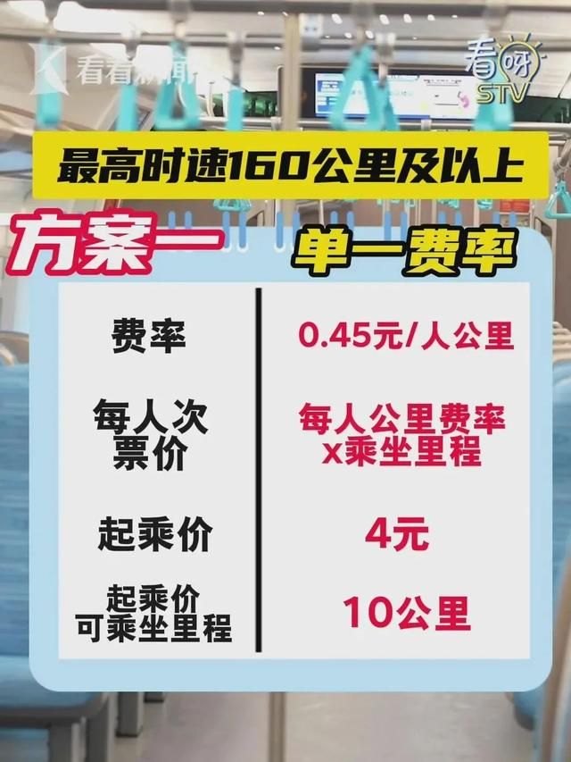 计划进行听证的票价方案有两种,一种为全程单一票价,按每公里每人0.45元计价;另一种为阶梯费率,距离越长,价格越低,区间为每公里每人0.48元至0.4元不等。起乘价均为4元。