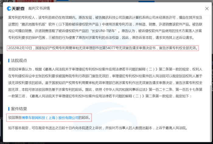 腾讯于2020年9月末起诉博泰车联网商标侵权及不正当竞争,随后博泰车联网联合上汽通用五菱以垄断为由对腾讯进行反诉,请求腾讯停止侵犯其“导航设备及XX路XX路况的提示方法与设备”发明专利(专利号ZL201210573182.2)等,结果所持专利被国家知识产权局专利局宣告涉案专利权全部无效,博泰车联网诉讼请求也被法院驳回。