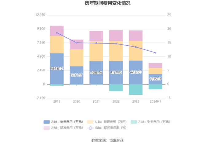 2024年上半年,公司期间费用为2907.78万元,较上年同期减少339.56万元;期间费用率为11.43%,较上年同期下降0.29个百分点。其中,销售费用同比下降3.34%,管理费用同比下降33.51%,研发费用同比增长19.67%,财务费用由去年同期的-977.54万元变为-860.13万元。
