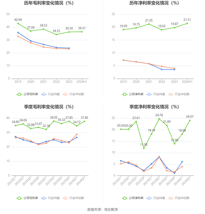2024年上半年,公司毛利率为36.51%,同比上升0.93个百分点;净利率为21.51%,较上年同期下降0.49个百分点。从单季度指标来看,2024年第二季度公司毛利率为37.85%,同比下降0.20个百分点,环比上升3.13个百分点;净利率为24.07%,较上年同期下降0.71个百分点,较上一季度上升5.99个百分点。