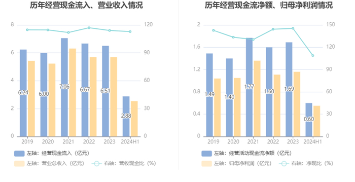 2024年上半年,公司营业收入现金比为112.99%,净现比为108.93%。