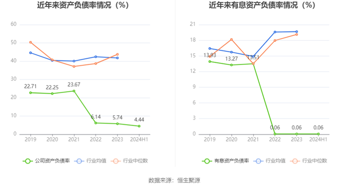 在偿债能力方面,公司2024年上半年末资产负债率为4.44%,相比上年末下降1.30个百分点;有息资产负债率为0.06%,相比上年末基本持平。