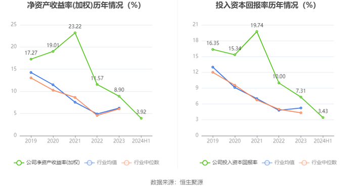 盈利能力方面, 2024年半年度公司加权平均净资产收益率为3.92%,同比下降0.67个百分点。公司2024年上半年投入资本回报率为3.43%,较上年同期下降0.59个百分点。