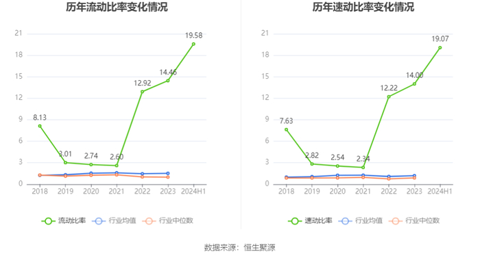 2024年上半年,公司流动比率为19.58,速动比率为19.07。