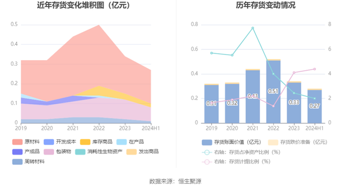 从存货变动来看,截至2024年上半年末,公司存货账面价值为2703.92万元,占净资产的2.01%,较上年末减少567.9万元。其中,存货跌价准备为124.5万元,计提比例为4.4%。