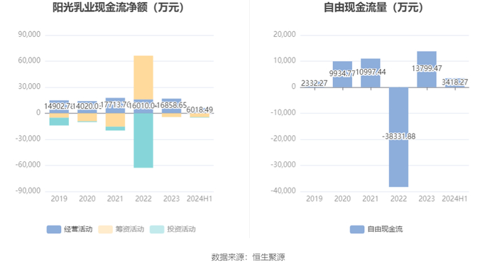 2024年上半年,公司经营活动现金流净额为6018.49万元,同比下降27.53%;筹资活动现金流净额-4522.56万元,同比减少282.66万元;投资活动现金流净额-544.55万元,上年同期为-1121.58万元,主要系公司处置生物性资产等收到现金所影响所致。