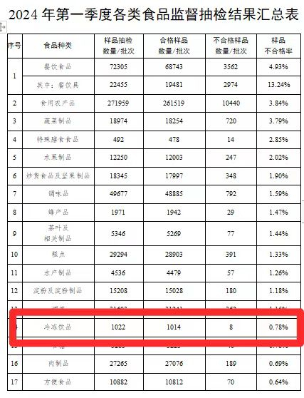 国家市场监督管理总局发布的《关于2024年第一季度市场监管部门食品安全监督抽检情况的通告》显示,雪糕、冰棍所属的冷冻饮品的样品抽检数量/批次为1022,不合格样品数量/批次为8,样品不合格率为0.78%。