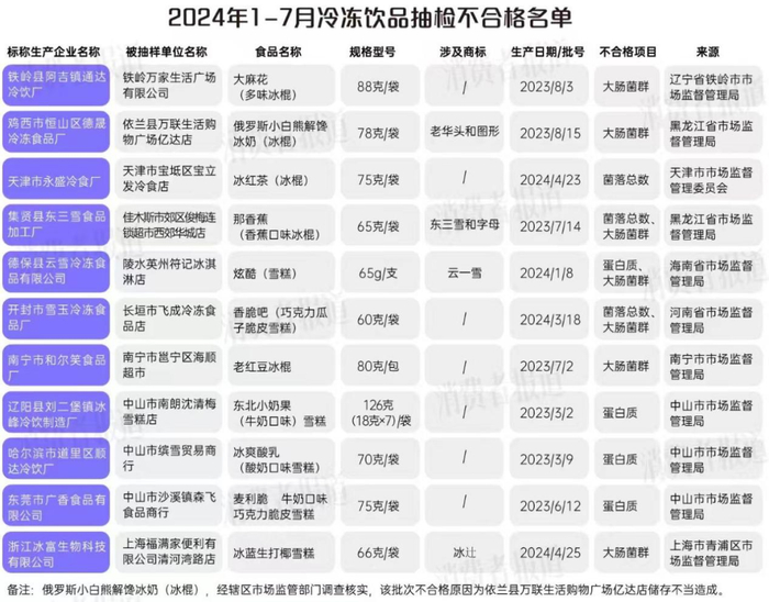 据悉,此次报道中不合格冷冻产品产主要涉及6批次雪糕、5批次冰棍,不合格项目集中在大肠菌群、蛋白质、菌落总数三项