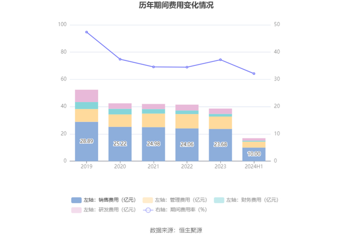 2024年上半年,公司期间费用为16.85亿元,较上年同期减少3.05亿元;期间费用率为32.13%,较上年同期下降0.70个百分点。其中,销售费用同比下降19.14%,管理费用同比下降1.17%,研发费用同比下降15.74%,财务费用同比下降29.21%。
