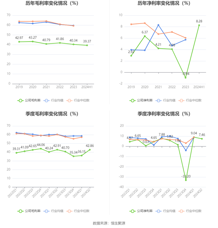 2024年上半年,公司毛利率为39.37%,同比下降2.19个百分点;净利率为8.28%,较上年同期上升1.42个百分点。从单季度指标来看,2024年第二季度公司毛利率为42.86%,同比下降0.05个百分点,环比上升6.71个百分点;净利率为7.46%,较上年同期上升1.64个百分点,较上一季度下降1.58个百分点。