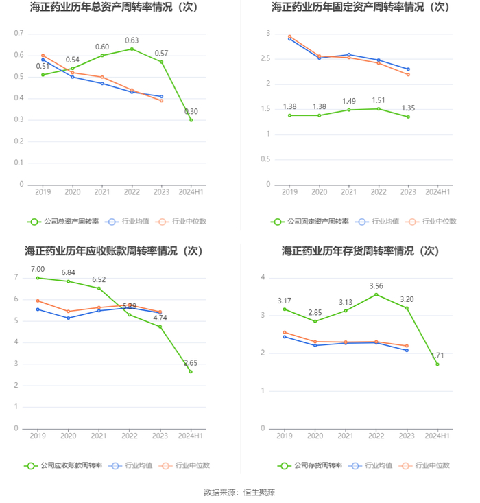 营运能力方面,2024年上半年,公司公司总资产周转率为0.30次,上年同期为0.33次(2023年上半年行业平均值为0.21次,公司位居同行业24/113);公司应收账款周转率、存货周转率分别为2.65次、1.71次。