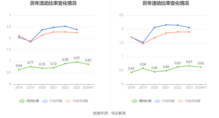 2024年上半年,公司流动比率为0.87,速动比率为0.62。