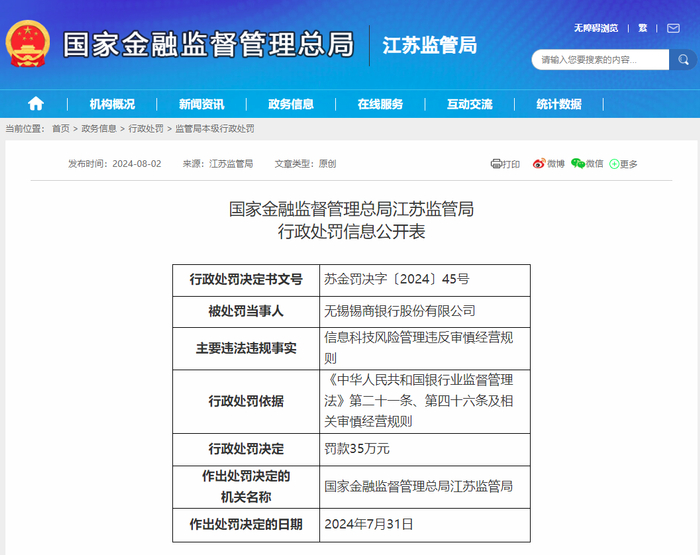 最近,国家金融监督管理总局江苏监管局披露一则行政处罚信息,处罚内容显示,无锡锡商银行股份有限公司因信息科技风险管理违背审慎经营规则,被处以35万元人民币的罚款。
