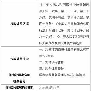 8月16日,浙江网商银行股份有限公司(下称网商银行)因存在13项违法违规行为,被国家金融监督管理总局浙江监管局罚款735万元。