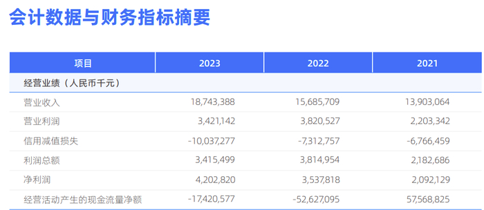 整体看2023年年报,网商银行资产总额达4521.30亿元,较年初增长2.50%。实现营业收入187.43亿元,同比增长19.49%;实现净利润42.03亿元,同比增长18.80%。
