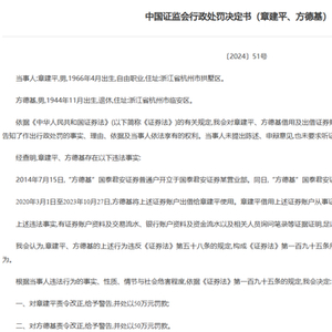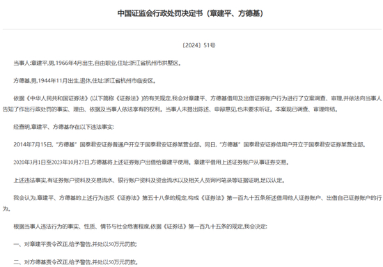 处罚决定书显示,章建平违规借用他人证券账户,构成《证券法》第一百九十五条所述借用他人证券账户的行为,而出借证券账户的人是章建平的岳父方德基。两人均被证监会处以50万元的顶格罚款。