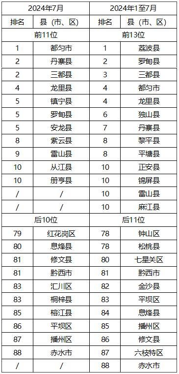 依据《城市环境空气质量排名技术规定》,按环境空气质量综合指数(简称综合指数)进行排序,2024年1至7月,9个中心城市环境空气质量由好到差依次为:都匀市、铜仁市、凯里市、兴义市、贵阳市、安顺市、六盘水市、毕节市、遵义市。88个县(市、区)城市环境空气质量相对较好的前13位(从第1名到第10名,含并列)为:荔波县、罗甸县、三都县、都匀市、龙里县、独山县、丹寨县、黎平县、平塘县、正安县、锦屏县、雷山县、麻江县,城市环境空气质量相对较差的后11位(从第78名到第88名,含并列)为:钟山区、松桃县、七星关区、黔西市、金沙县、平坝区、息烽县、播州区、修文县、六枝特区、赤水市。