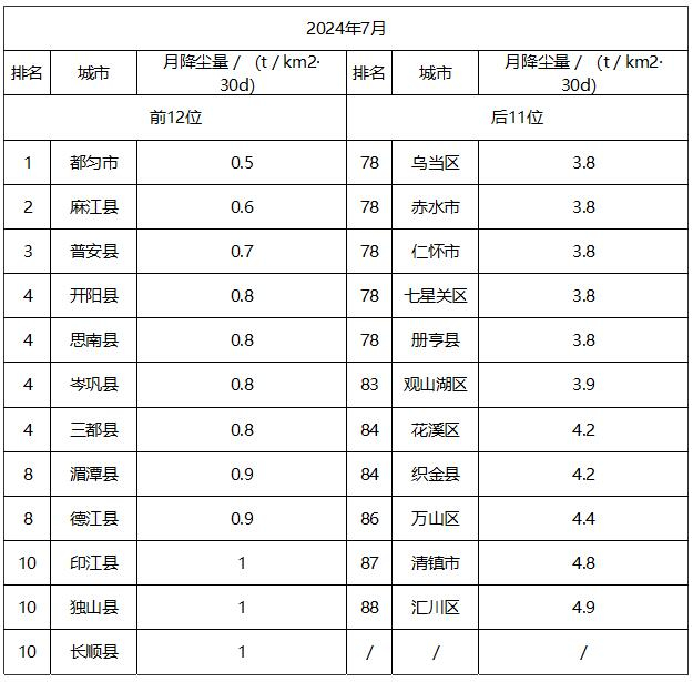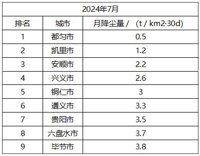 2024年7月,全省9个中心城市降尘量均达到《贵州省环境空气质量降尘》月限值要求,由低到高依次为:都匀市、凯里市、安顺市、兴义市、铜仁市、遵义市、贵阳市、六盘水市、毕节市。全省88个县(市、区)降尘量均达到《贵州省环境空气质量降尘》月限值要求,由低到高前12位(从第1名到第10名,含并列):都匀市、麻江县、普安县、开阳县、思南县、岑巩县、三都县、湄潭县、德江县、印江县、独山县、长顺县,后11位(从第78名到第88名,含并列):乌当区、赤水市、仁怀市、七星关区、册亨县、观山湖区、花溪区、织金县、万山区、清镇市、汇川区。