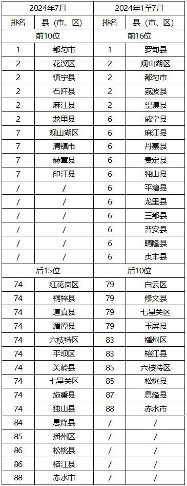 按PM2.5平均浓度进行排序,2024年1至7月,9个中心城市由低到高依次为(含并列):都匀市、兴义市、贵阳市、六盘水市、铜仁市、凯里市、安顺市、遵义市、毕节市。88个县(市、区)由低到高的前16位(从第1名到第6名,含并列):罗甸县、观山湖区、都匀市、荔波县、望谟县、威宁县、麻江县、丹寨县、贵定县、独山县、平塘县、龙里县、三都县、普安县、晴隆县、贞丰县,后10位(从第79名到第88名,含并列):白云区、修文县、七星关区、玉屏县、播州区、榕江县、六枝特区、松桃县、息烽县、赤水市。