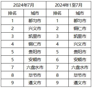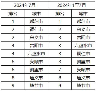 依据《城市环境空气质量排名技术规定》,按环境空气质量综合指数(简称综合指数)进行排序,2024年7月,9个中心城市环境空气质量由好到差依次为(含并列):都匀市、兴义市、凯里市、铜仁市、贵阳市、安顺市、六盘水市、毕节市、遵义市。88个县(市、区)城市环境空气质量相对较好的前11位(从第1名到第10名,含并列)为:都匀市、丹寨县、三都县、龙里县、镇宁县、罗甸县、安龙县、紫云县、雷山县、从江县、册亨县,城市环境空气质量相对较差的后10位(从第79名到第88名,含并列)为:红花岗区、息烽县、修文县、黔西市、汇川区、桐梓县、榕江县、平坝区、播州区、赤水市。