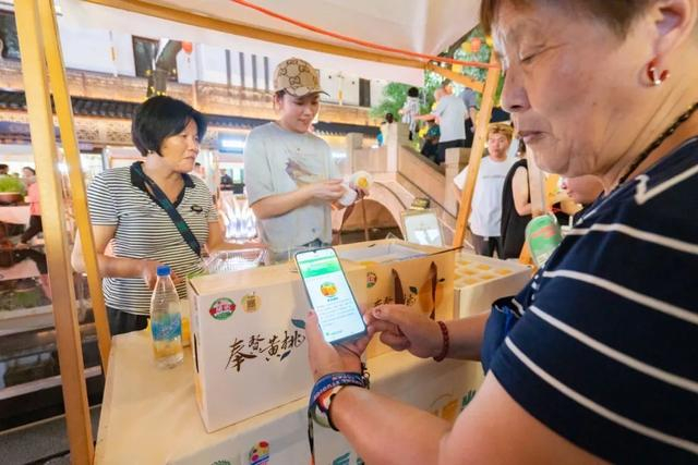 作为奉贤区的代表性农产品,色泽金黄、水润诱人的黄桃吸引了众多游客驻足品尝,现场人头攒动,热闹非凡,在夜幕中也能感受到市民的热情。