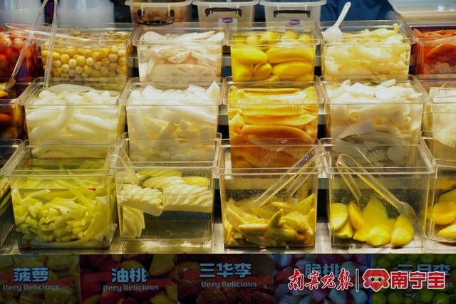 萝卜酸、芒果酸、菠萝酸……万物皆可酸,走进埌西夜市、西关夜市、平西夜市等夜市街,众多水果、蔬菜做成的酸嘢盛在玻璃缸里,操着各地口音的食客边吃边聊,市井气息扑面而来。“酸酸甜甜的,很好吃。”来自东北的游客李女士对南宁特色酸嘢赞不绝口,没想到水果可以做成酸嘢吃。
