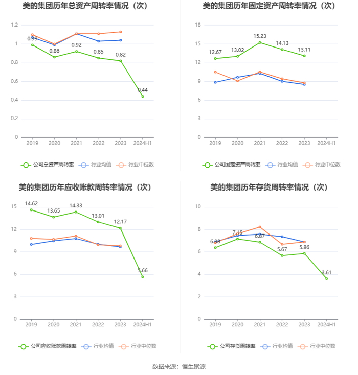 营运能力方面,2024年上半年,公司公司总资产周转率为0.44次,上年同期为0.45次(2023年上半年行业平均值为0.52次,公司位居同行业7/10);公司应收账款周转率、存货周转率分别为5.66次、3.61次。