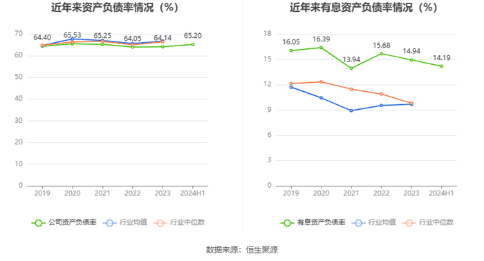 在偿债能力方面,公司2024年上半年末资产负债率为65.20%,相比上年末上升1.06个百分点;有息资产负债率为14.19%,相比上年末下降0.75个百分点。
