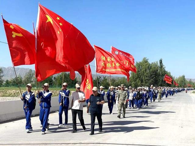 8月16日,宁夏回族自治区吴忠市同心县第八中学全体教师和高一年级学生,共千余人开展“赓续红色血脉,传承红色基因”重走长征路活动,徒步46公里后到达王团镇北堡子(陕甘宁省豫海县回民自治政府办公旧址)。(宁夏回族自治区吴忠市同心县委宣传部供图)