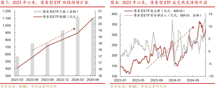 债券型ETF对指数有出色的跟踪能力。我们测算了历史所有29只债券型ETF在2023年以来净值的平均值,发现其与基准指数净值的偏差一直不超过0.5倍标准差,跟踪误差仅为0.01%。同时,债券型ETF的容量能够支撑轮动策略的构建,体现在2023年以来债券型ETF市场规模不断扩张,成交热度持续升温。