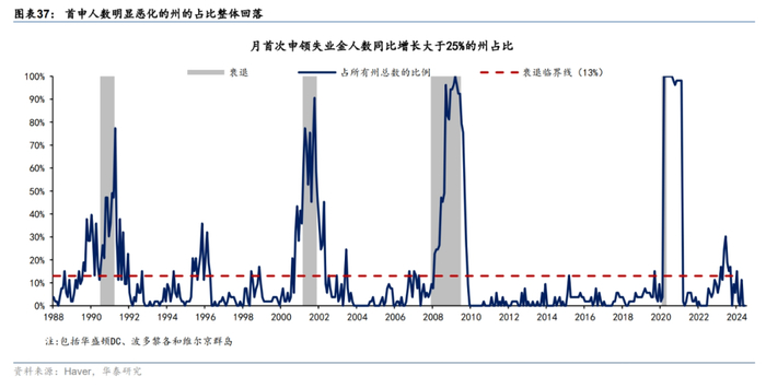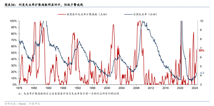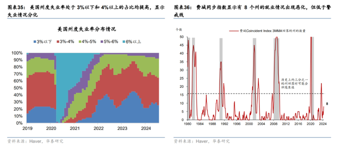 美国州层面失业率扩散指数显示失业率接近警戒线,但各州失业率的分布仍相对健康。历史上美国州度失业率扩散指数对美国的失业率有一定领先性,在美国州层面失业率扩散指数接近 60%后,3-6个月后全国层面失业率会出现大幅上行。截至7月,州度失业率扩散指数从年初的接近0%升至55%,显示州度失业情况出现恶化,但仍低于60%的警戒线(图表34)。从州度的失业率分布图来看,相较年初,失业率位于3%以下和失业率位于4%以上的州占比均小幅增加,显示美国的整体失业有所分化,但未出现全面恶化的迹象(图表35)。