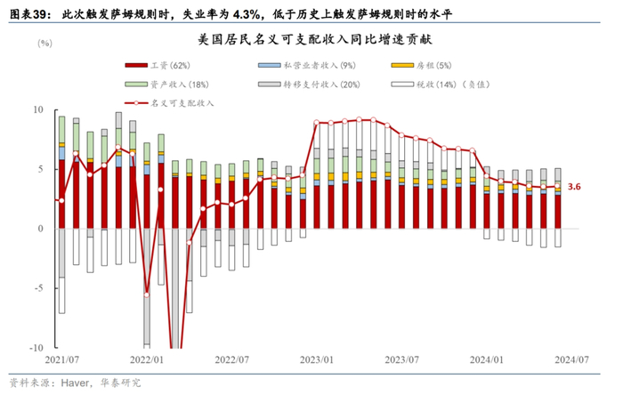 未来6-12个月,在逆周期政策不大幅滞后、低于预期的基准情形下,失业率大幅上升触发衰退的概率仍低。基准情形下,我们预计政策宽松或可以及时托底经济,目前基本面的状态不支持衰退;然而,如果政策误判过晚宽松、或全球经济出现较大的下行压力,拖累美国外需,则浅衰退的可能性将上升。