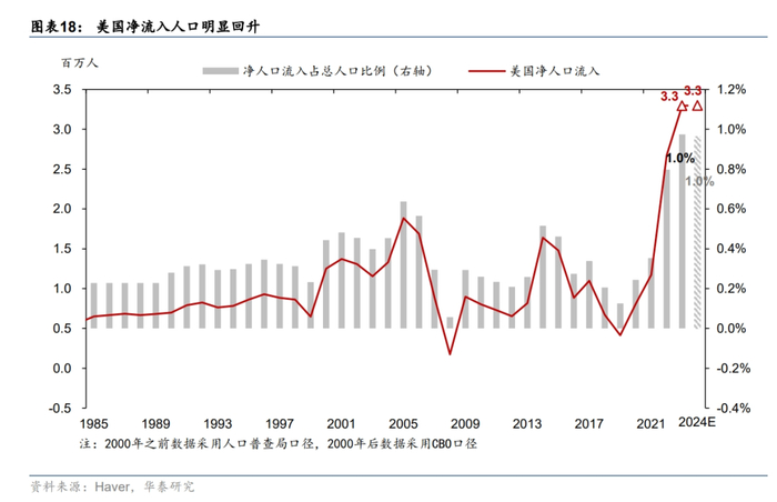 失业率对应的家庭调查(CPS)可能低估了美国本土居民和移民的就业情况。Brookings指出[6],由于家庭调查是根据前一年固定的人口增长预测模型来调整,没有考虑到移民大幅流入的意外影响,因此家庭调查(CPS)低估了美国本土出生人口的就业人数(CPS估计2023年美国本土出生的就业人数下降19万,而Brookings预计增加74万,差值约占美国本土居民就业总人数的0.7%)和移民的就业人数(CPS估计2023年美国外国出生人口的就业人数增加120万,而Brookings预计增加170万,差值约占美国外国出生就业总人数的1.6%)