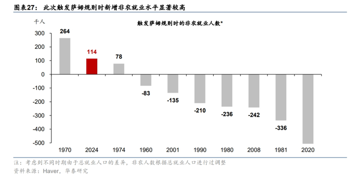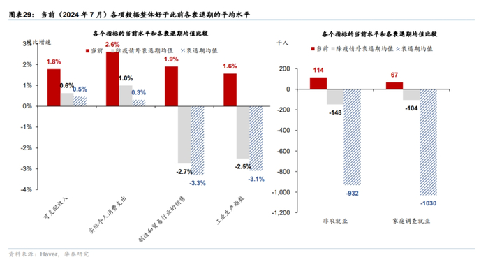 当前主要经济数据好于此前萨姆规则被触发时。从失业率和非农就业的角度看,当前劳动力市场环境好于历史同期,此次触发萨姆规则时失业率为4.3%,大幅低于其他触发萨姆规则时的失业率均值(6.7%),且触发之前的失业水平也处于明显的低位(图表25和26)。此次触发萨姆规则时新增非农就业为11.4万人,为1960年以来第二高的水平(图表27)。此外,除当前和1974年外,其余时期触发萨姆规则及以前的四个月内新增非农就业均出现过转负情况(图表28)。从NBER定义衰退的六个关键指标来看(包括剔除转移支付后的个人实际收入、企业调查的非农就业、家庭调查的就业、实际个人消费支出、实际制造和贸易销售以及工业生产指数),历史上衰退期间居民的可支配收入和实际个人消费支出的同比增速会明显偏弱,制造和贸易行业的销售、工业生产、家庭和企业调查的就业等指标的均值为负,而目前各项指标的水平均高于各个衰退期的均值(图表29),整体仍相对健康。