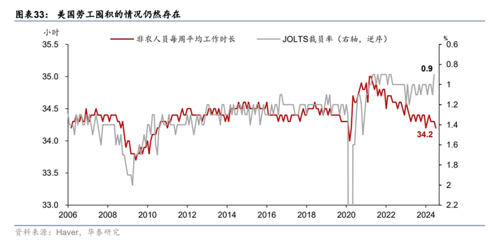 美国就业市场日益接近“正常化”。第一,劳动供给和需求的缺口显著收窄。2023年3季度以来,美国劳工需求见顶回落,但劳工供给延续了回升态势,导致美国劳工总供给和总需求的差距持续收窄,供需缺口从峰值的620万人大幅收窄至130万人,且以每月平均25万人的速度进一步收窄(图表30)。第二,贝弗里奇曲线进一步正常化,岗位空缺与失业率的关系回到疫情前。贝弗里奇曲线显示,今年以来岗位空缺与失业率的关系回到疫情前,即伴随着岗位空缺的回落,失业率可能上行(图表32)。第三,劳工市场的流动性明显下降,一定程度上减少了企业的招聘需求,但劳工囤积的现象仍然存在。今年以来,JOLTS企业招聘和离职率均显著下滑且低于疫情前(图表31),显示就业市场的流动性减弱,联储褐皮书也表示[4]流动性下降减少了企业新招聘的需求,且部分企业在招聘时会更谨慎,而不是填补所有的岗位空缺。但劳工囤积(labor hoarding)[5]的现象仍然存在:疫情以来,美国在职员工的平均工作时长明显下降,但裁员率整体变动不大(图表33)。