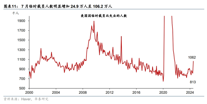 7月失业率上行主要受到临时裁员影响。美国7月临时裁员的人数跳升24.9万(图表11),约占7月失业人数增幅的七成,对失业率的贡献为0.15pp,剔除临时裁员后失业率为4.1%。从州层面看(州层面的就业数据主要见第三部分),对失业率有一定领先性的州度的失业率扩散指数有所上升,但仍低于警戒线,且部分州的失业率上行可能受到暂时性因素的影响,例如密歇根(汽车厂停工)和德州(受飓风影响)等。