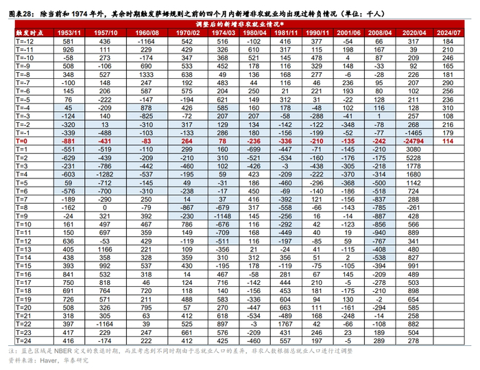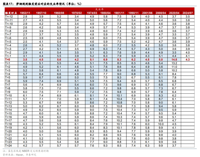 萨姆规则只是确认经济陷入衰退的经验规则,这次可能不一定成立。萨姆规则作为判断衰退的经验准则,在1953年来,有14次被触发,其中11次伴随着经济在一年内衰退,因此市场通常以萨姆规则作为判断衰退的触发器(图表16)。但就时点而言,萨姆规则触发时点通常晚于NBER确认的衰退起始时点,一般滞后2-4个月(图表17)。考虑到2季度美国GDP数据显示美国经济动能仍高于潜在增速,萨姆规则滞后于衰退的这一经验规律似乎不适用于此次。此外,历史上也出现过触发萨姆规则但没有衰退的情形,例如1959年12月、1976年11月以及2003年7月等,均一度触发萨姆规则但均未出现衰退。