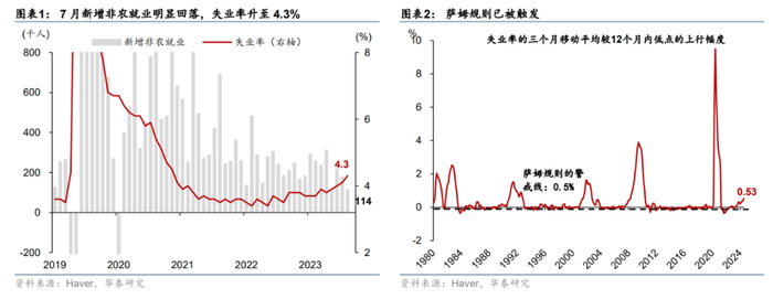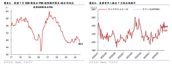 7月美国多个就业指标走弱超预期,加大对美国经济衰退风险的担忧。7月美国非农就业报告整体不及预期:新增非农就业回落6.5万至11.4万,低于彭博一致预期的17.5万,5-6月累计下修2.9万;小时薪资环比增速超预期回落0.1pct至0.2%;失业率更是上行至4.3%(图表1),触发萨姆规则(萨姆规则是指当失业率的三个月移动平均值相较过去12个月最低的三个月移动平均值上升幅度达到0.5个百分点时,即意味着经济已经开始衰退)(图表2)。此前公布的其他就业相关指标也走弱较为明显:7月ISM制造业PMI超预期回落至46.8,为2023年12月以来新低(图表3),就业分项也从6月的49.3大幅回落至43.4;首次申领失业金的人数也一度出现跳升(图表4)。部分联储官员担忧就业市场快速走弱的风险。此前表态偏鹰的前纽约联储主席Dudley在7月24日[1]明显转鸽,表示劳动力市场恶化会产生一个自我强化的负循环,联储应该在7月尽快降息。8月14日,芝加哥联储主席古尔斯比也表示[2]劳动力市场和一些经济领先指标正在闪烁警告信号,且存在失业率将持续上升的担忧;越来越担心就业而不是通胀;需要在就业市场进一步疲软之前降息。