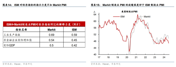ISM制造业PMI制造业分项对短期就业的指示意义有限,且波动较大。ISM制造业PMI对美国经济指标(包括工业生产指数、非金融企业增加值)的解释力度整体不如Markit制造业PMI(图表14),而7月Markit制造业PMI有所回落但幅度小于ISM制造业PMI(图表15),因此预计美国制造业实际增长动能可能好于ISM制造业PMI的指示。