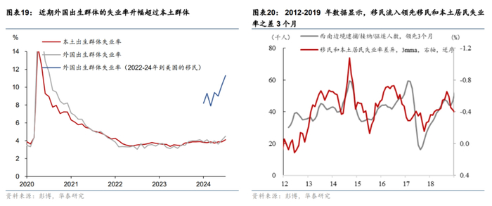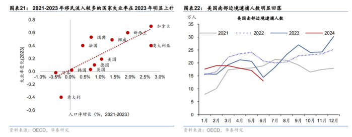 移民大规模流入导致劳工供给明显增加,并且推动了失业率的上行。2023年以来移民的大幅流入推高了人口增速,CBO预计2023和2024年每年净人口约占总人口的1.0%,大幅高于2010-2019年0.3%的均值(图表18)。移民大幅流入推高劳工供给可能是失业率走高的原因。美国历史数据显示移民大幅流入领先于移民和本土居民失业率之差3个月,这意味着移民大幅流入可能导致移民的失业情况显著高于本土居民(图表19)。7月外国出生群体失业率超过本土出生群体;彭博进一步指出2022-2024年新移民美国群体的失业率为11%左右,大幅高于外国出生人口的整体失业率(图表20)。萨姆本人也表示,移民大幅流入的加州、新泽西州和纽约州也经历了失业率的显著上升,但这可能是由就业摩擦导致的,即新进入移民无法在短期内找到工作,因此不能简单应用萨姆规则。此外,2021-2023年人口净流入较多的国家2023年的失业率上升更加明显(图表21)。值得注意的是,如我们在《移民放缓或导致美国非农就业回落》,2024/6/20中所述,2024年上半年移民可能有所放缓。美国海关与边境保护局(CBP)数据显示,美国南部边境逮捕人数较此前明显放缓,同比增速从年初的12%大幅回落至6月的-9.8%(图表22)。移民流入放缓可能滞后拖累下半年的非农就业,未来也可能缓解失业率的上行。