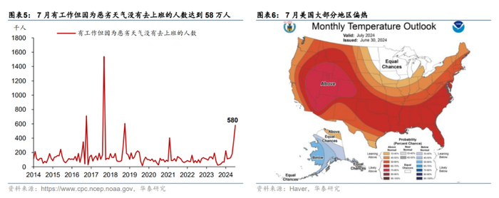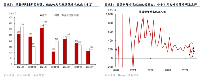 非农数据受到飓风和气温扰动,且波动较大。飓风可能是拖累7月就业市场的暂时性因素之一。尽管BLS表示飓风对非农数据的影响不显著,但7月因为天气原因没有去上班的人上升21万至58万(图表5),BLS或低估了飓风的影响,从德州首申人数可以看到,飓风登录德州后首申上升约2万人。此外,美国气温偏高也可能降低工作意愿从而减少就业,旧金山联储的模型显示,气温偏高可能压低非农就业约1.5万人(图表6和7)。我们预计飓风和气温拖累新增非农就业约3.5万人。此外,非农数据波动较大,此前多次出现大幅回落后再次反弹的情况,例如今年4月新增非农人数一度回落至10.8万人,而5月反弹至21.6万(图表8)