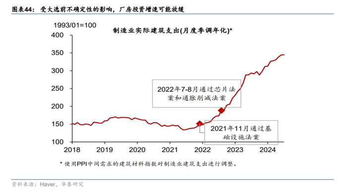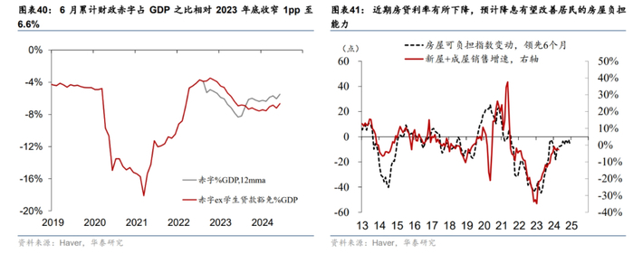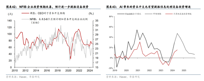未来6-12个月,在逆周期政策不大幅滞后、低于预期的基准情形下,失业率大幅上升触发衰退的概率仍低。我们认为,在没有出现明显政策失误的情况下,未来6-12个月美国经济有望实现软着陆。第一,消费有所降温,但财富效应提供支撑:收到工资增长放缓,以及缴税增加的影响,2024年居民收入增速预计将放缓,预计将从2023年的8%回落至3.6%(图表39),但股市和房价上涨可能推动居民净财富回升,压低居民储蓄率,实际消费预计维持在2%左右。第二,财政边际收紧,但幅度有限:截至6月,美国累计财政赤字占GDP之比相对2023年底收窄1pp至6.6%(图表40)。但二季度美国财政支出的季比折年增速出现反弹,且CBO 6月的对全年赤字的更新预测为6.7%,高于2月时5.6%,显示全年的财政紧缩力度或低于此前预期,第三,投资温和修复,地产方面,利率回落提振地产销售(图表41),但7月地产新开工回落超预期,地产投资修复空间受限;企业投资预期边际改善,温和提振设备投资(图表42),而AI带来的资本开支提振信息处理设备投资增速(图表43);受大选前产业政策不确定性的影响,此前受产业政策提振的厂房投资增长可能放缓(图表44)。