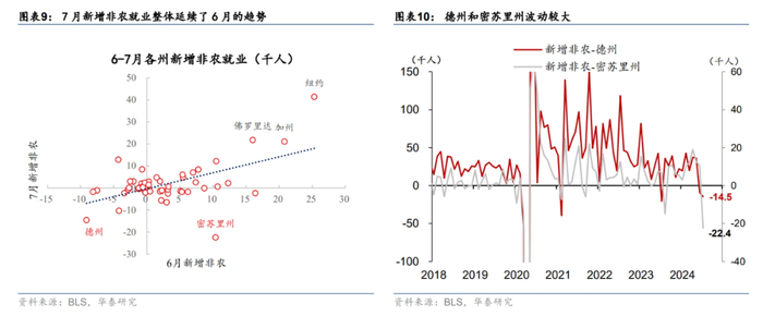 从州层面就业看,德州和密苏里州新增非农波动较大。州层面的新增非农数据显示各州7月新增非农整体延续了6月的趋势,反映了劳工市场仍处于降温趋势中(图表9)。但部分州波动可能较大。例如德州和密苏里州(图表10)。德州自2014年以来仅在疫情时期连续两个月新增非农就业为负,但今年6-7月连续两个月的新增非农就业为负,背后可能反映了飓风等一次性因素的扰动。密苏里州则出现了新增非农就业的大幅下滑,7月新增非农下降22.4万人,为近十年来除了疫情的最差水平。其中接近一半来自于政府部门裁员 ,约1/4来自于教育医疗,背后可能是由于密苏里州对财政预算的削减在7月新财年生效,导致部分政府和项目人员减少。