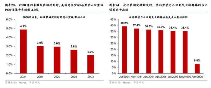 历史规律显示,此前萨姆规则被触发时劳工需求明显降温。2000年以来,触发萨姆规则时,美国岗位空缺/总劳动人口整体的均值为2.7%,明显低于当前的4.9%,显示此前的劳工需求整体偏弱(图表23)。此外,失业群体可以按照失业前的状态进一步拆分为从就业状态到失业的群体以及从非劳动力人口(Not in labor force)状态到失业的群体。其中新进入、尚未找到工作的移民通常归属于从非劳动力人口(Not in labor force)状态到失业的群体。数据同样显示,1980年以来,此次萨姆定律触发时,从非劳动力人口到失业群体占总失业人数的比例高于历史水平,显示供给对失业影响大于此前(图表24)。