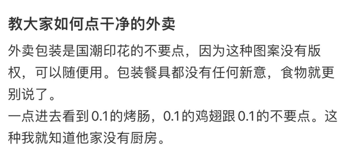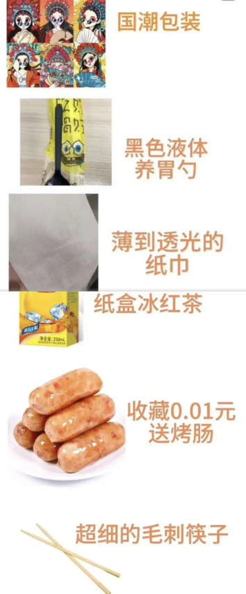 国潮少女包装的流行也引发了消费者一系列关于廉价外卖联想,有网友总结了一起出现的其他元素。