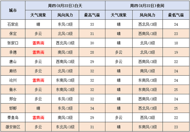 今天夜间,秦皇岛阴有中到大雨,其他地区多云间阴有分散性雷阵雨或阵雨。最低气温,张家口、承德北部、保定西北部13~18℃,其他地区19~24℃。