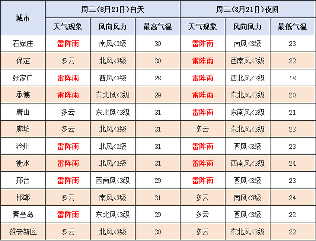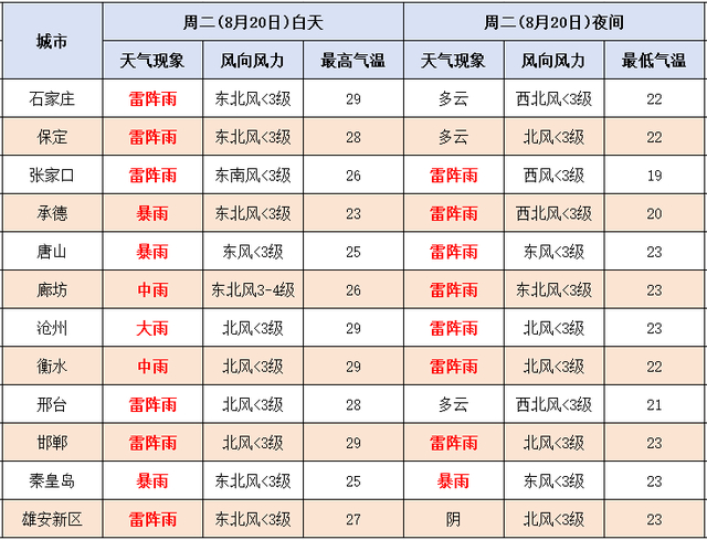今天白天,张家口北部、承德、唐山、秦皇岛、廊坊、沧州阴有中到大雨,局地有暴雨,个别点有大暴雨,其他地区多云转阴有雷阵雨或阵雨,降雨时局地伴有雷电、短时强降水、短时大风等强对流天气。最高气温,张家口中北部、承德、保定西北部、秦皇岛北部19~24℃,其他地区25~29℃。