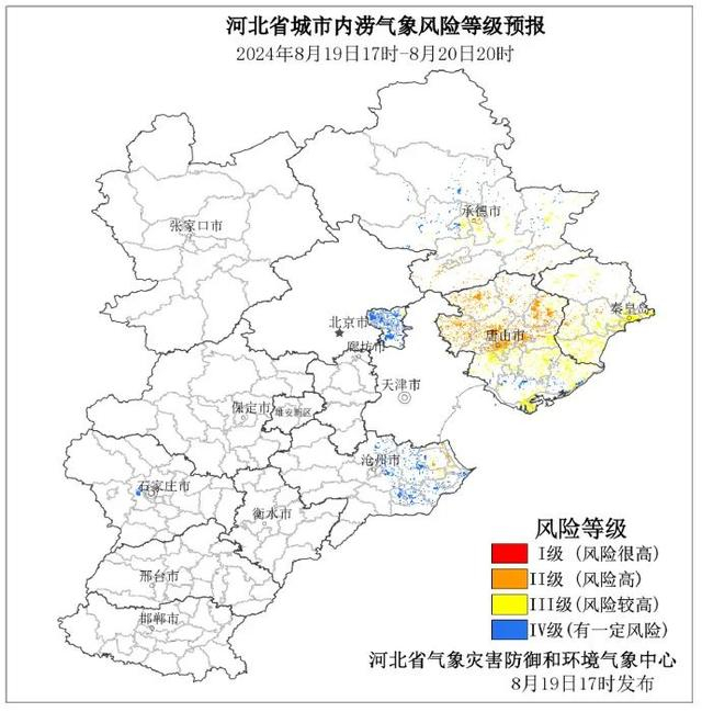 预计8月19日17时至20日20时,承德中南部、唐山、秦皇岛、廊坊北部、沧州中东部以及石家庄局部等地城市内涝气象风险等级为Ⅳ级及以上,有发生城市内涝的风险,其中,承德市(双桥区、鹰手营子矿区、兴隆县、宽城满族自治县)、唐山市(遵化市、迁西县、玉田县、丰润区、迁安市、路北区、开平区、古冶区、滦州市)、秦皇岛市(青龙满族自治县、卢龙县、抚宁区)、沧州市(黄骅市)城市内涝气象风险等级为Ⅱ级,发生城市内涝的风险高,请注意防范。