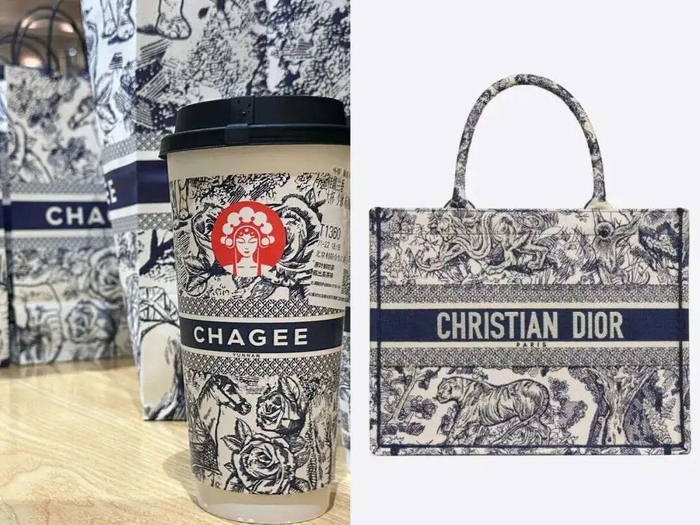 为了摆脱与茶颜悦色相似的国风形象,霸王茶姬还在包材上直接借鉴奢侈品的设计。“去云南·玫瑰普洱”的包材被取名为“茶马古道杯”,白底蓝印花配以茶马古道上的大象、玫瑰、茶树和马,直接让人联想到了法国奢侈品牌迪奥(Dior)在上一年推出的BookTote手提包。不同之处在于,迪奥的纹样是一只老虎、一只狮子和一只猴子。